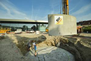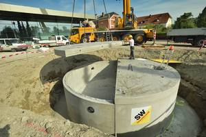 Das Versetzen des 36 m³ großen Behälters in modularer Fertigteilbauweise dauert gerade einmal 1,5 Stunden.